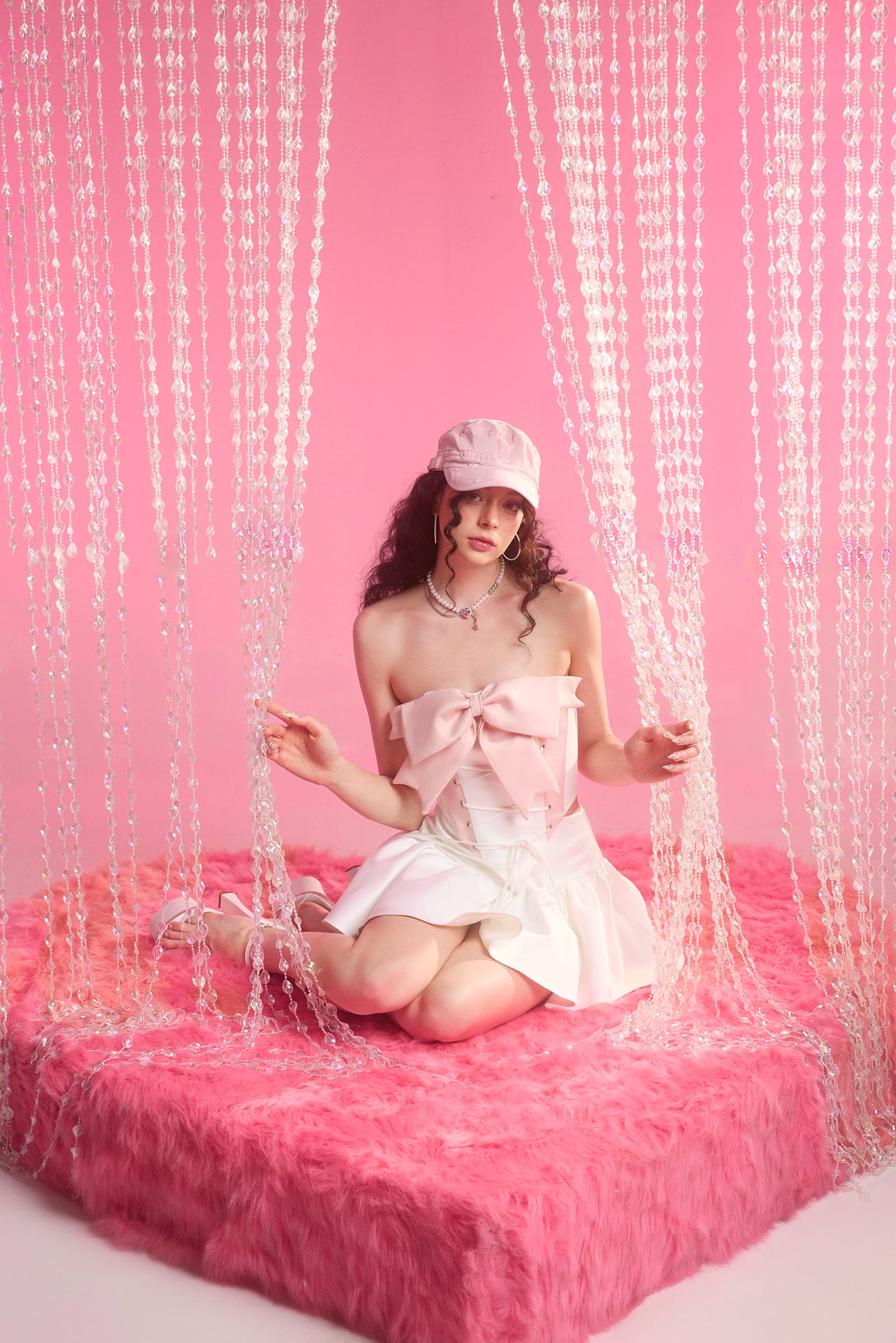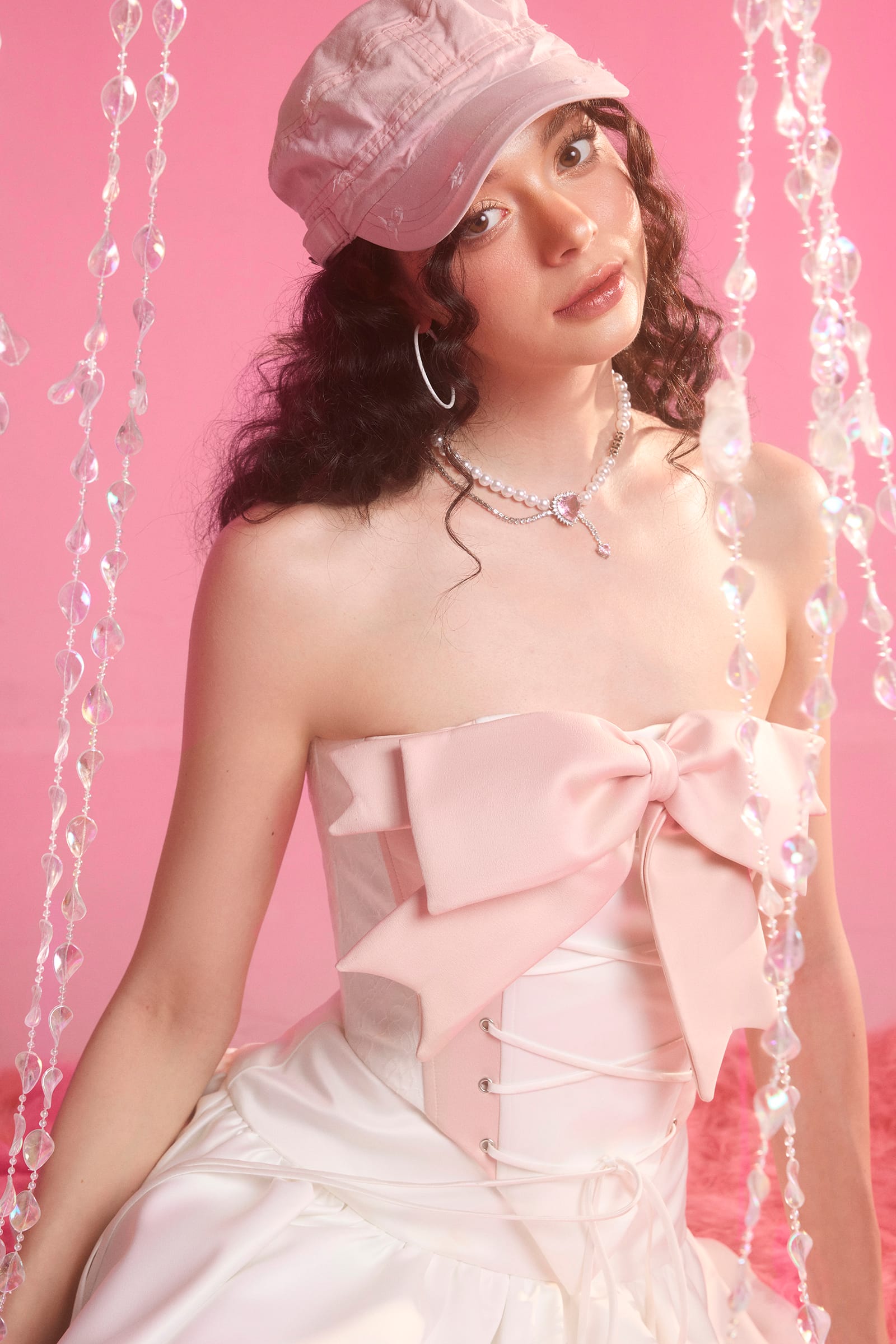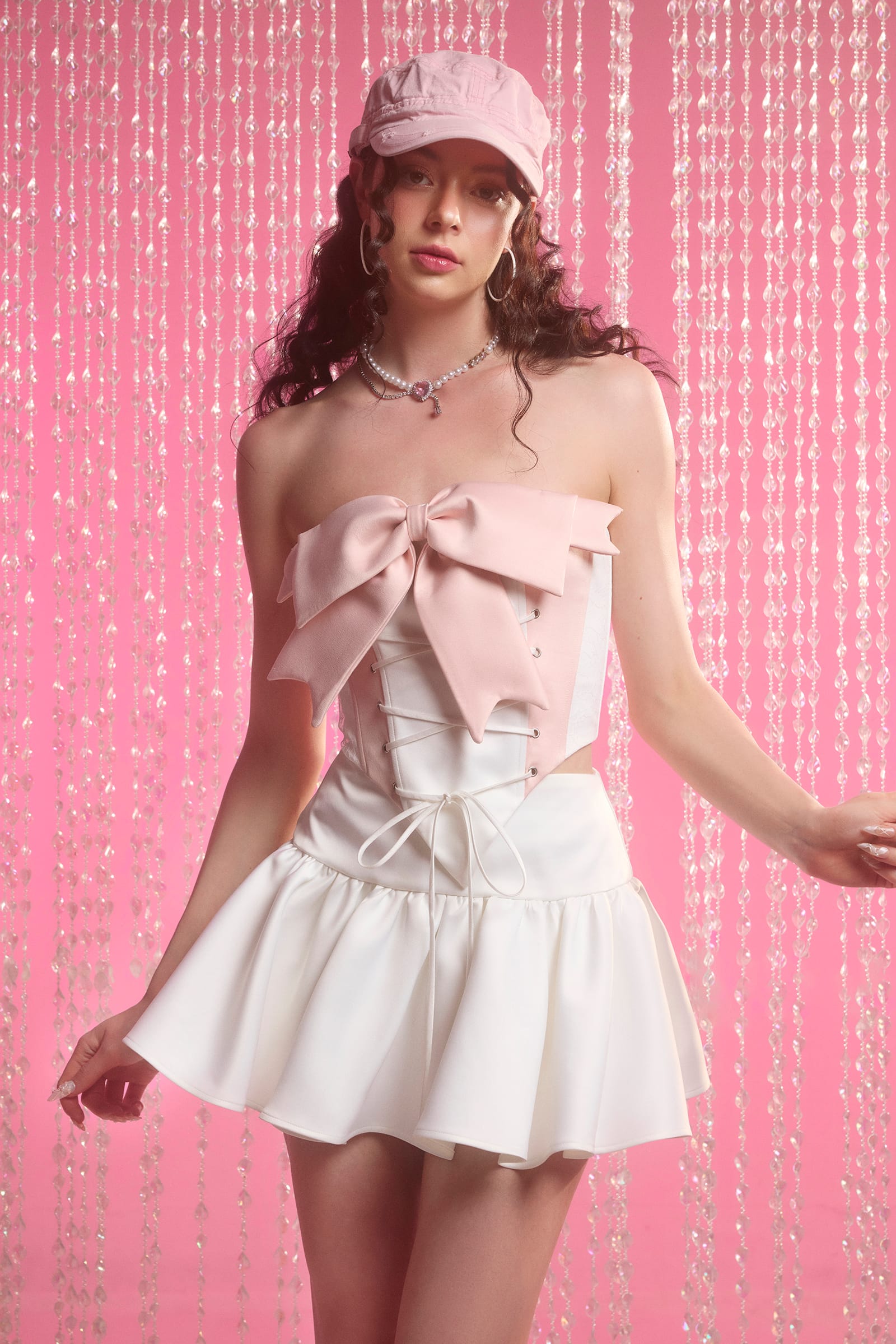 The bustier top features a white-pink color, adorned with a horizontal bow across the chest, creating a cute and eye-catching accent. The bustier top also has lace-up closure at the front, allowing for adjustable width and snugness while adding another focal point. The skirt with ruffled flounce hem brings a princess-like, sweet, and elegant look to the wearer. In this outfit, the skirt with ruffled flounce hem in white tone perfectly complements the white bustier top, creating a harmonious and coordinated ensemble.