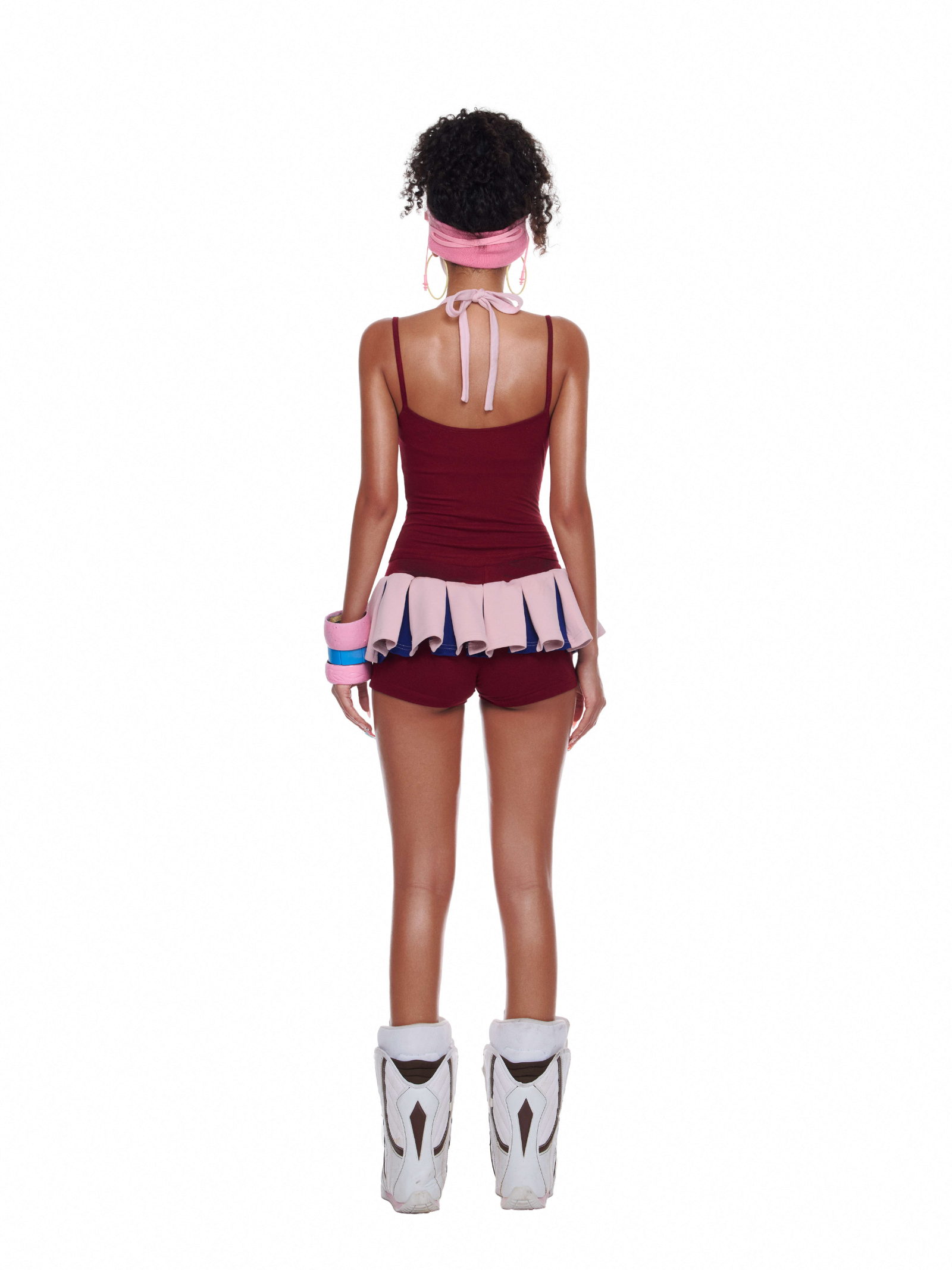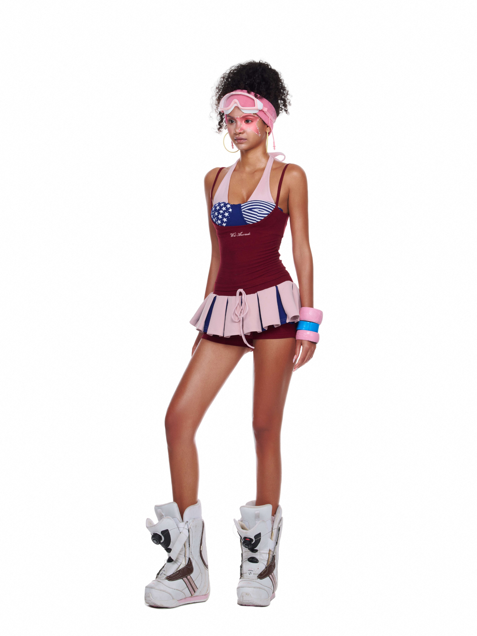 Lấy cảm hứng từ cổ động viên, Maga Set là tuyên ngôn thời trang cho những cô nàng cá tính, năng động. Thiết kế liền thân ôm dáng màu đỏ burgundy, điểm nhấn là phần ngực họa tiết cờ Mỹ cùng chân váy xếp ly hồng pastel – tạo nên tổng thể vừa gợi cảm vừa năng động giúp thu hút mọi ánh nhìn.