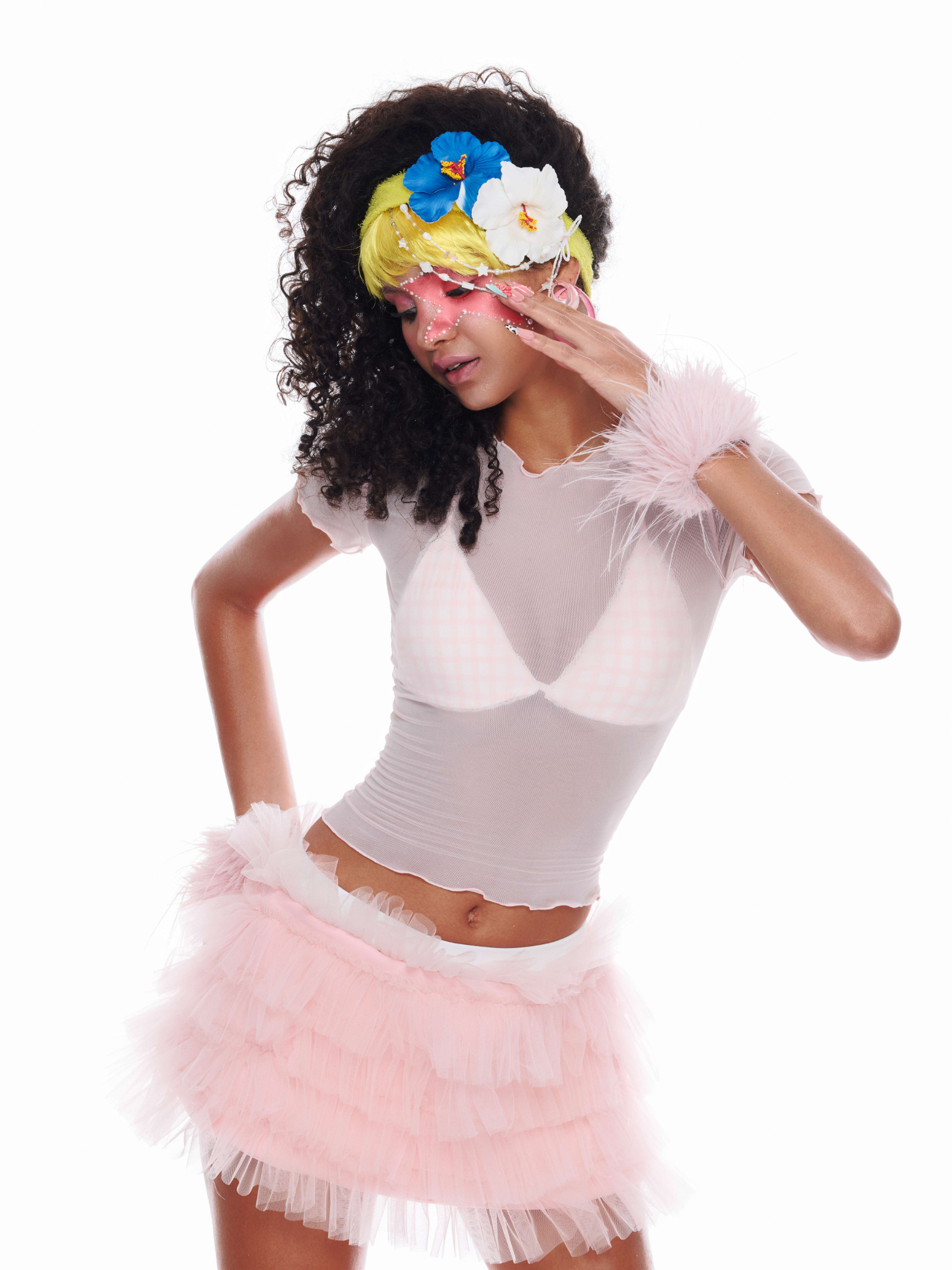 Malibu – Bộ đồ biển mang hơi thở của những ngày hè mơ màng. Với áo thun xuyên thấu, bra caro hồng pastel và chân váy tulle bồng bềnh, thiết kế này vừa dịu dàng, vừa tinh nghịch. Malibu gợi cảm giác như một làn gió nhẹ lướt qua bờ cát hồng, dành cho những cô nàng thích mang theo chút mộng mơ đến biển.