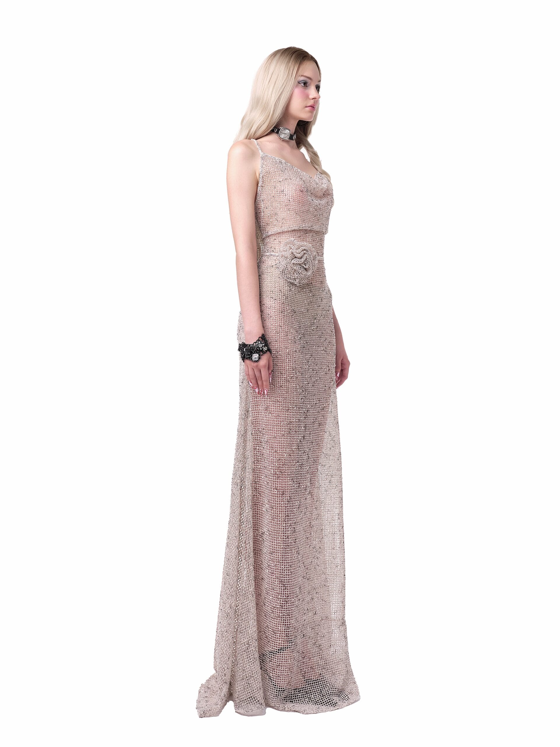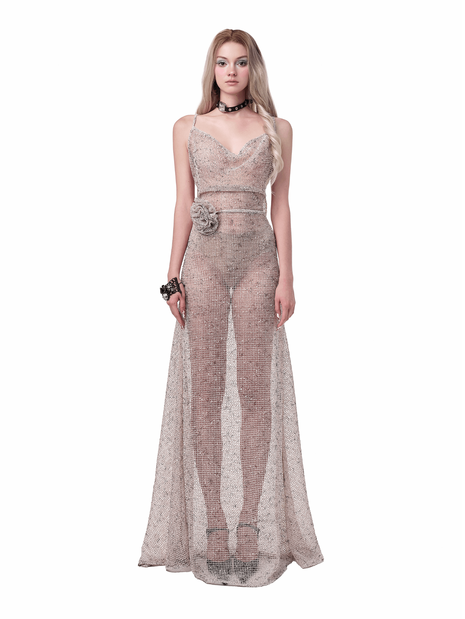 This floor-length mermaid gown is crafted from high-quality cotton mesh fabric. With its gentle beige tone, this ensemble not only exudes the beauty of sophistication but also provides optimal comfort for the wearer. The design features thin straps, a plunging neckline, and subtle back cutouts, honoring the alluring and sensual beauty of women. This gown is undoubtedly the perfect choice for elegant parties or special occasions where you want to become the center of attention.